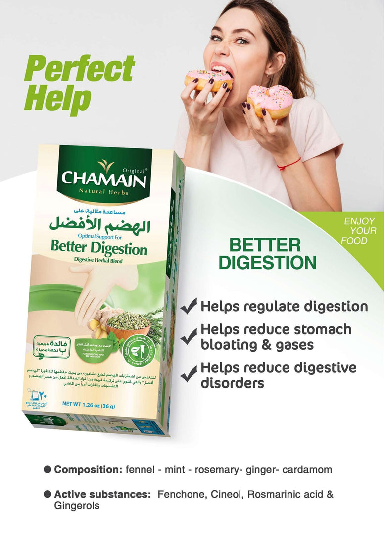 Sammansättning: fänkål, mynta, rosmarin, ingefära och kardemumma